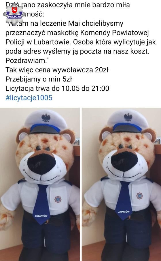 Zarząd Terenowy Niezależnego Samorządnego Związku Policjantów Komendy Powiatowej Policji w Lubartowie wraz z Komendą Powiatową Policji w Lubartowie przekazał na licytację sierżanta Lamparta - pluszową maskotkę Komendy Powiatowej Policji w Lubartowie. Zwycięzca licytacji przekazał maskotkę małej Mai. Zachęcamy do wsparcia dziewczynki: sie pomaga zycie mai