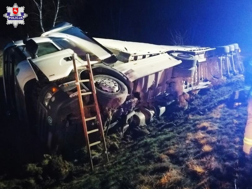 Do zdarzenia doszło wczoraj po godzinie 17.00 na obwodnicy Lubartowa w rejonie skrzyżowania z ulicą Aleje Zwycięstwa. Jak ustalili policjanci, kierujący ciągnikiem siodłowym marki Scania, 56-letni obywatel Serbii, chcąc umożliwić przejazd pojazdowi uprzywilejowanemu Straży Pożarnej zjechał na pobocze. W wyniku tego manewru koła ciężarówki zapadły się w trawiastym, podmokłym gruncie i samochód przewrócił się na bok.