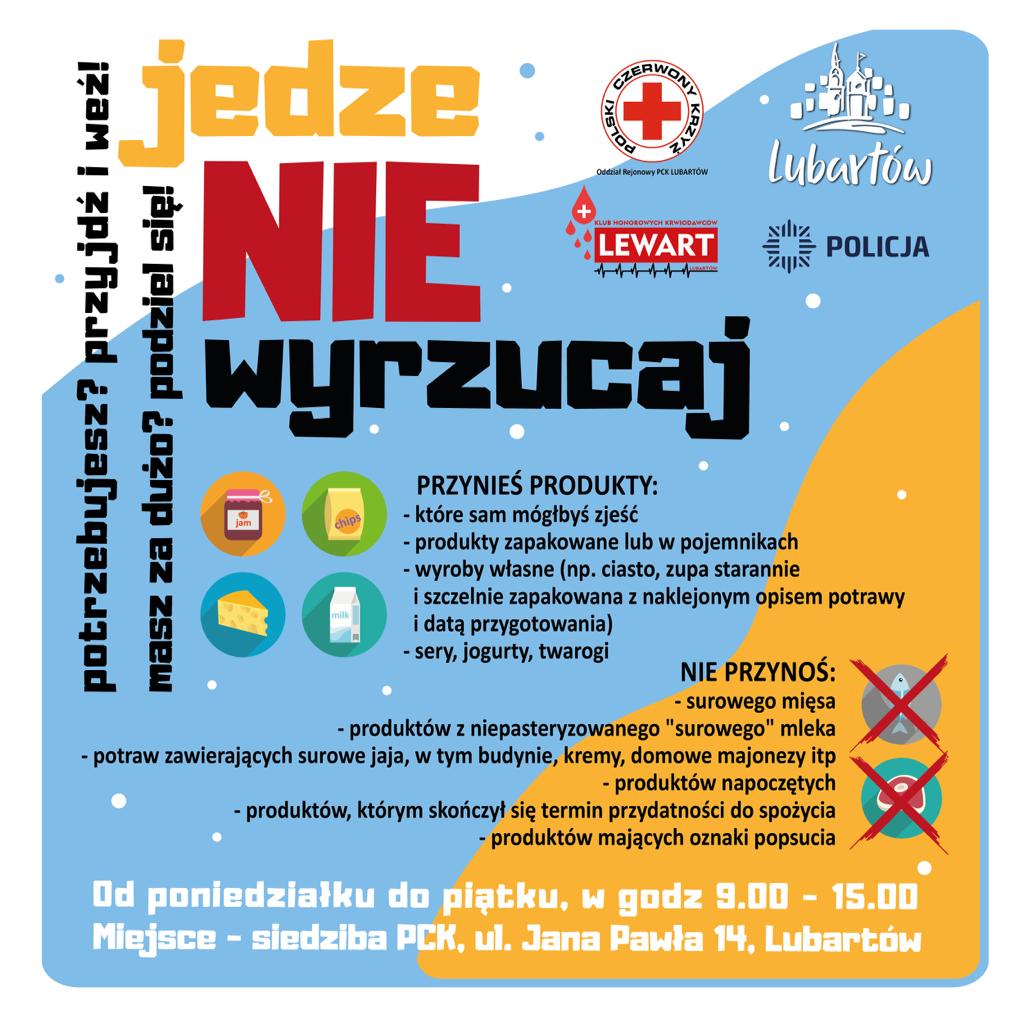 Komenda Powiatowa Policji w Lubartowie wraz z Urzędem Miasta Lubartów, Klubem Honorowych Krwiodawców Lewart i PCK Oddział Rejonowy w Lubartowie są współtwórcami projektu pod nazwą: ,,JedzeNIE wyrzucaj”. Każdy kto chce podzielić się jedzeniem z innymi, może przynieść produkty do punktu PCK w Lubartowie, gdzie znajduje się specjalna lodówka.