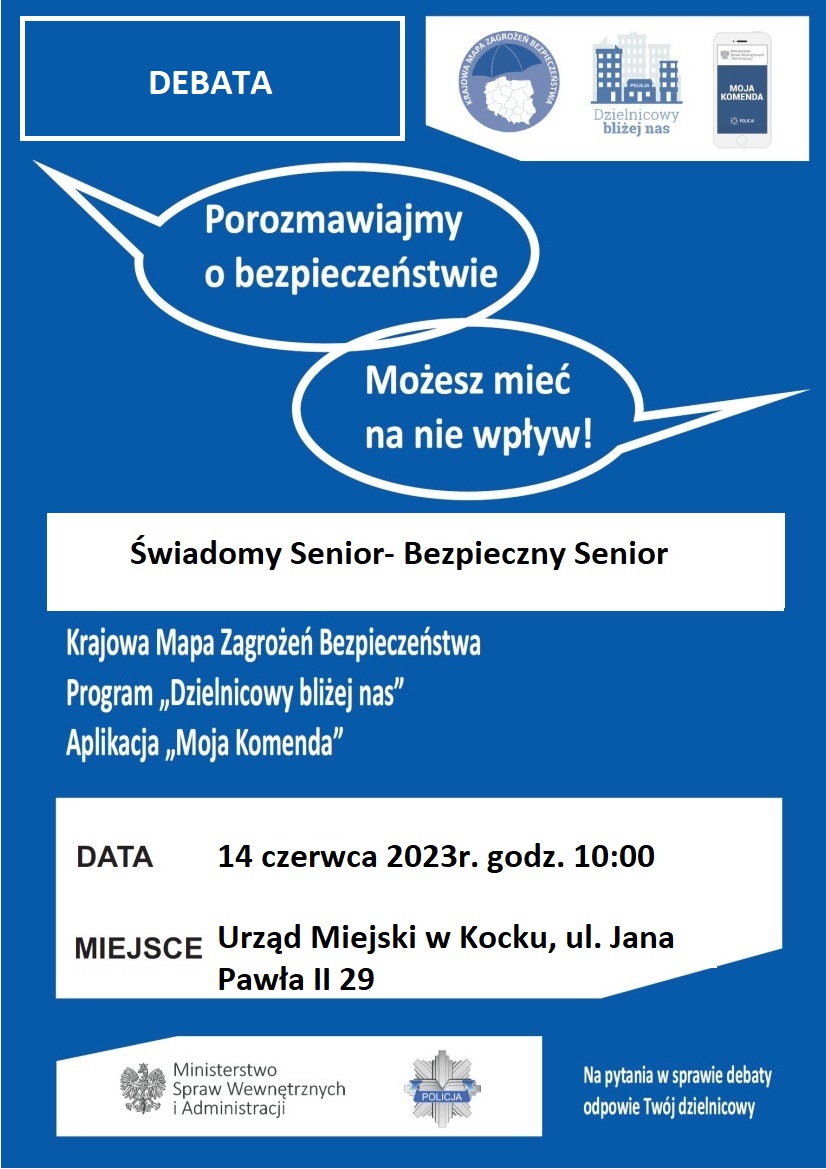 Głównym tematem debaty będzie bezpieczeństwo na terenie miasta i gminy Kock. Policjanci poruszą także temat oszustw na tzw.,,wnuczka” i policjanta. Celem spotkania jest poznanie potrzeb i oczekiwań mieszkańców w zakresie bezpieczeństwa i porządku publicznego. Omówione zostaną również informacje związane z Krajową Mapą Zagrożeń Bezpieczeństwa, aplikacją „Moja Komenda” i działaniami profilaktycznymi realizowanymi przez KPP w Lubartowie i Komisariat Policji w Kocku, oraz służbą dzielnicowych i ich działaniami priorytetowymi.