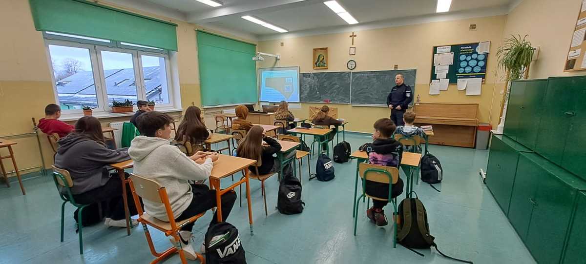 Zagadnienie to było głównym tematem wczorajszego spotkania policjantów: sierż. szt. Jagody Stanickiej i mł. asp. Grzegorza Kaczmarczyka z młodzieżą ze Szkoły Podstawowej w Nowym Uścimowie. Funkcjonariusze poruszyli temat bezpieczeństwa i zachowania uczniów w szkole, temat cyberprzemocy, a także mowy nienawiści i hejtu. Młodzież dowiedziała się co kryje się pod pojęciem demoralizacji i czym jest czyn karalny oraz co to jest przemoc rówieśnicza.