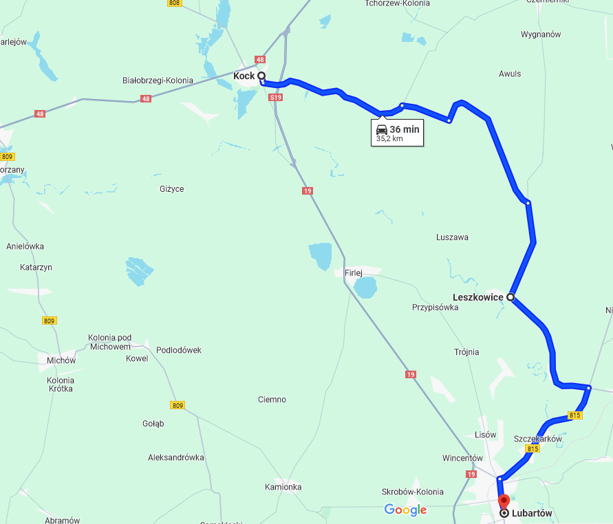 Trasa Kock-Lubartów (drogi lokalne): Kock- Leszkowice-Szczekarków-Lubartów