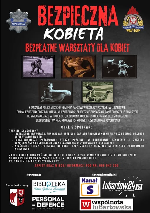 Zajęcia poprowadzą funkcjonariusze Policji, Straży Pożarnej oraz instruktorzy z firmy Personal Defence. Spotkanie to doskonała okazja, by zdobyć wiedzę i umiejętności, które mogą pomóc w trudnych sytuacjach. Udział w warsztatach jest bezpłatny, a liczba miejsc ograniczona. Zapraszamy serdecznie!