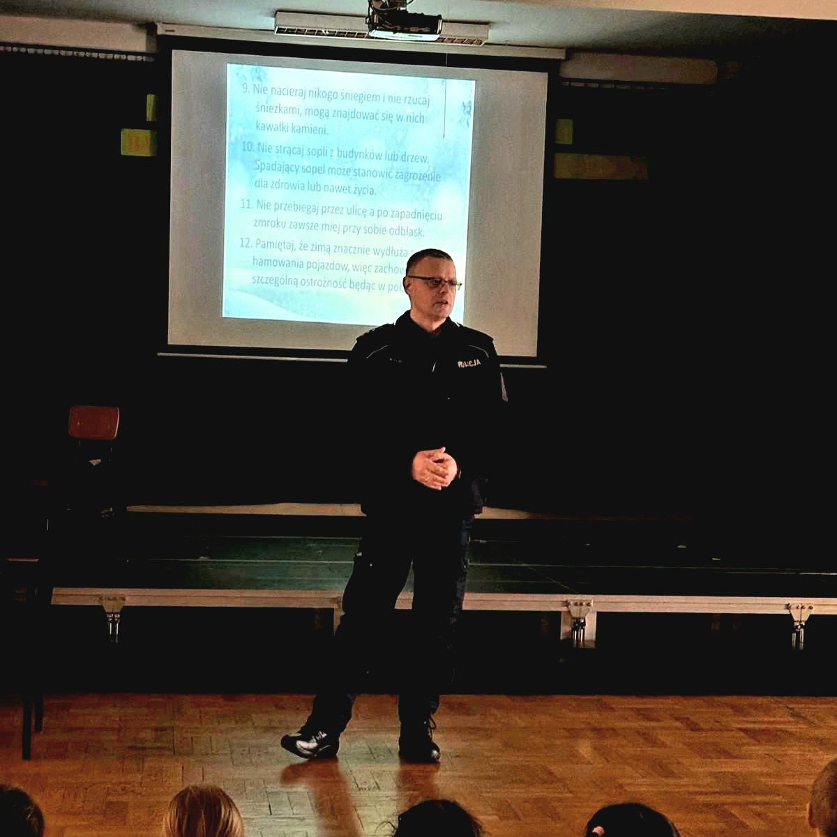 Pierwsze spotkanie odbyło się z najmłodszymi uczniami klas I–III. Policjanci rozmawiali z dziećmi o bezpiecznych feriach, omawiając m.in. zasady zachowania na stoku, na lodzie, w domu oraz w drodze na zimowy wypoczynek. Przypomnieli również, jak ważne jest noszenie elementów odblaskowych, które znacząco poprawiają widoczność i bezpieczeństwo na drodze.
