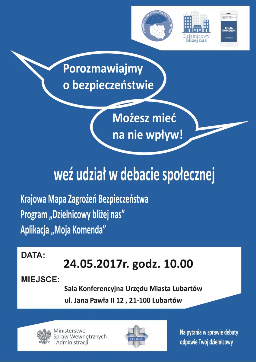 Komendant Powiatowy Policji w Lubartowie zaprasza mieszkańców na debatę społeczną pod nazwą „Porozmawiajmy o bezpieczeństwie – Możesz mieć na nie wpływ”, która odbędzie się w środę, 24 maja o godz. 10.00 w Sali Konferencyjnej Urzędu Miasta Lubartowa przy ul. Jana Pawła II nr 12.