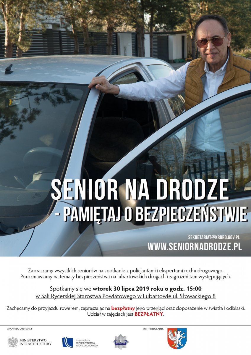 Zapraszamy wszystkich seniorów powiatu lubartowskiego na spotkanie z policjantami i ekspertami ruchu drogowego, które odbędzie się 30 lipca o godz. 15:00 w Sali Rycerskiej Starostwa Powiatowego w Lubartowie. Celem spotkania jest uświadomienie seniorów jak zgodnie z zasadami, prawidłowo i bezpiecznie poruszać się po drogach oraz jak unikać różnych niebezpieczeństw. Uczestnicy tego wydarzenia będą mogli m.in. bezpłatnie skorzystać z serwisu rowerowego, zweryfikować ostrość swojego wzroku czy też czas reakcji na zagrożenia, korzystając z odpowiednich przyrządów.