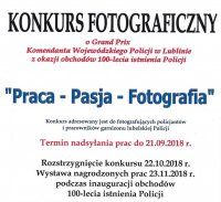 Komenda Wojewódzka Policji w Lublinie, z okazji obchodów 100 lecia istnienia Policji, organizuje konkursu fotograficzny o Grand Prix Komendanta Wojewódzkiego Policji insp. Roberta Szewca pn. „Praca - Pasja – Fotografia". Konkurs adresowany jest do wszystkich policjantów i pracowników garnizonu policji lubelskiej.